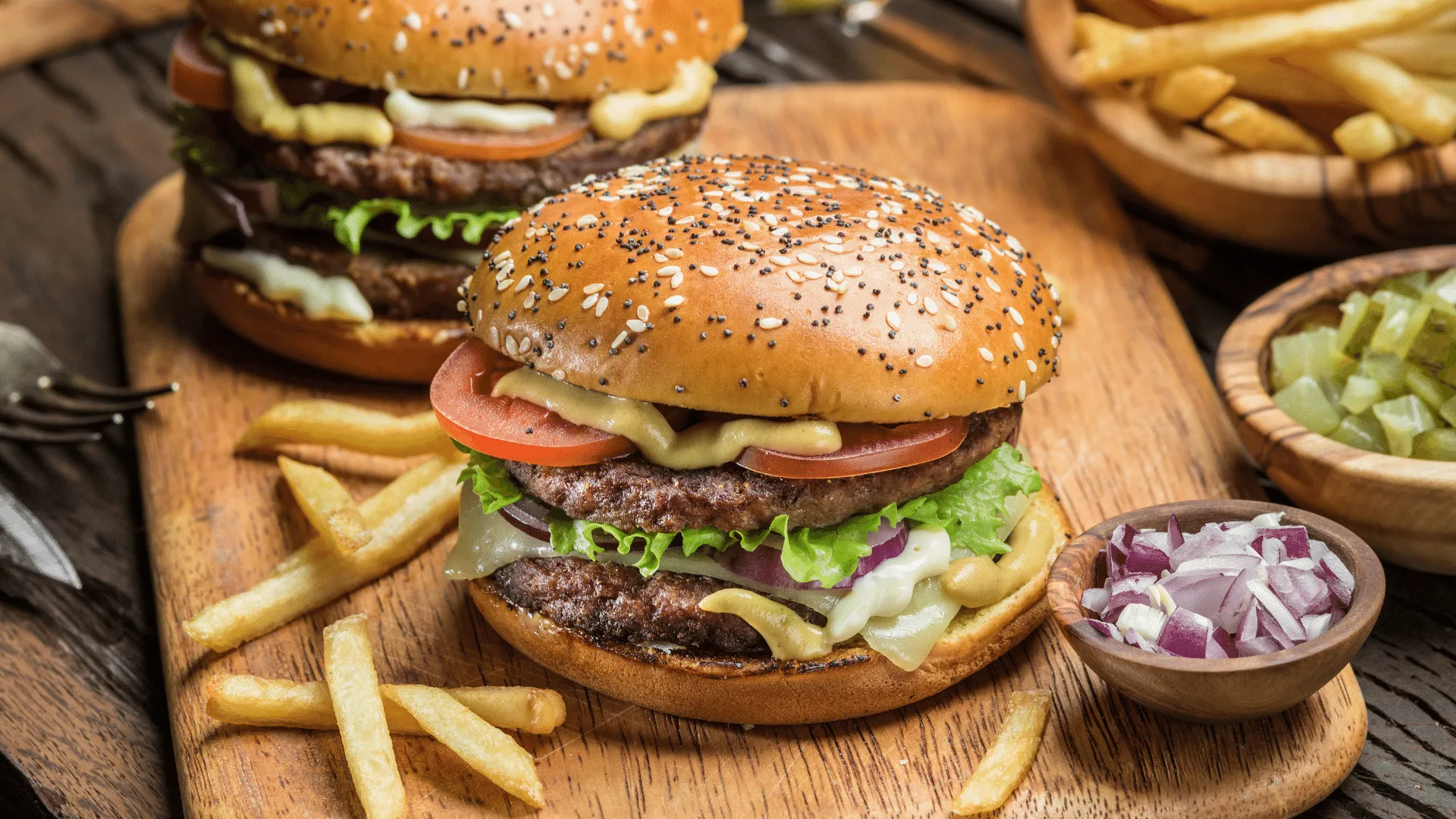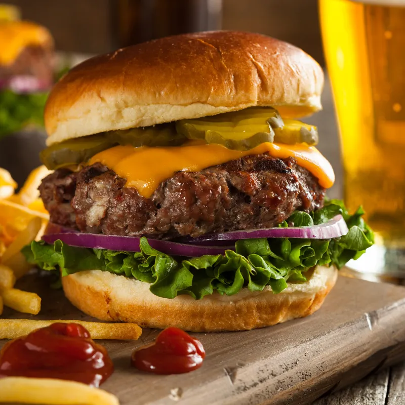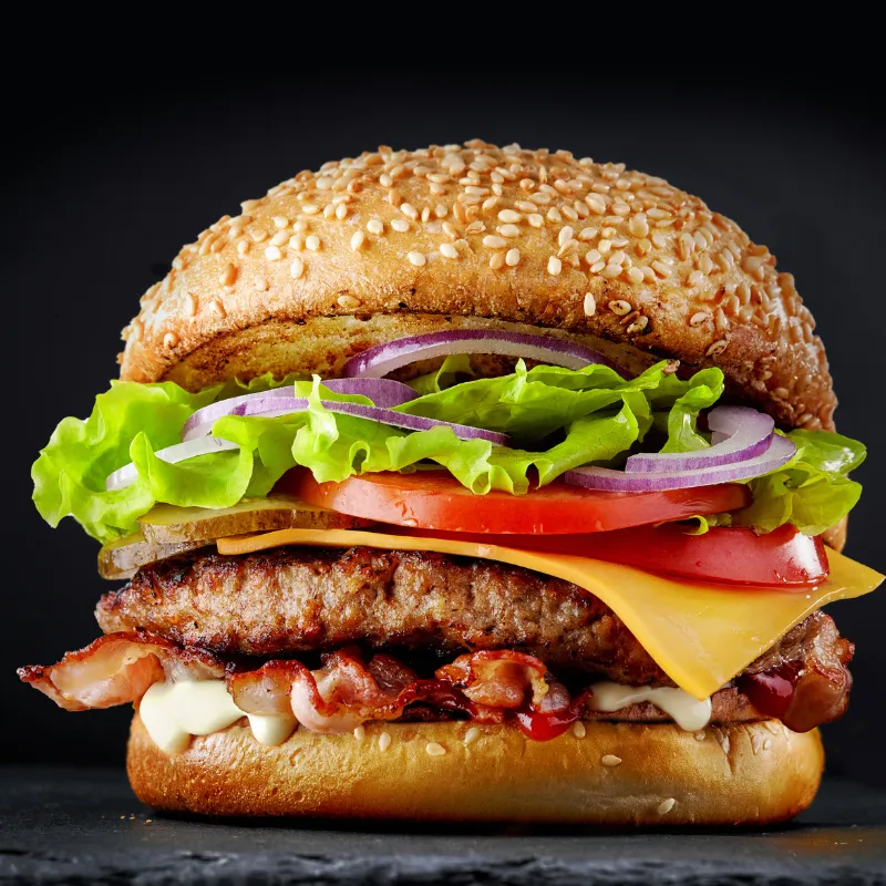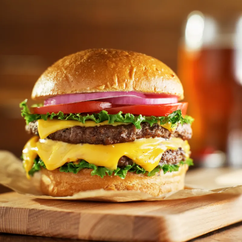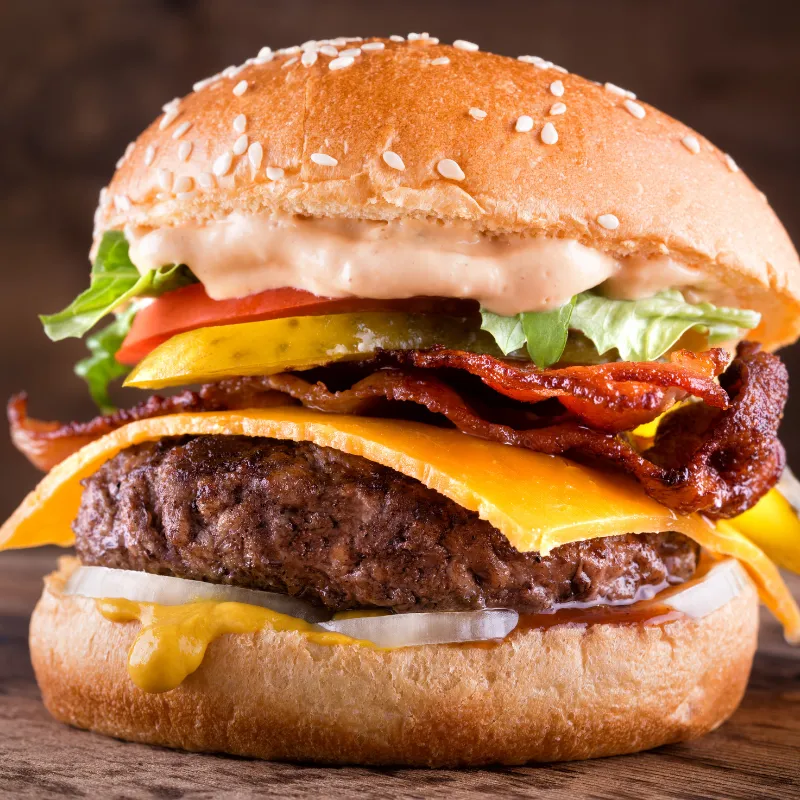 Two 1/4 pound 100% beef patties, two slices of American cheese, bacon, lettuce, tomato, onion and thousand island dressing. Combo meal comes with seasoned French fries and a medium fountain drink.