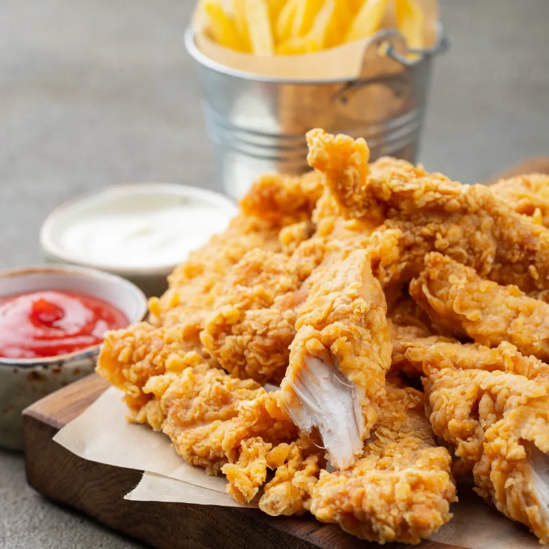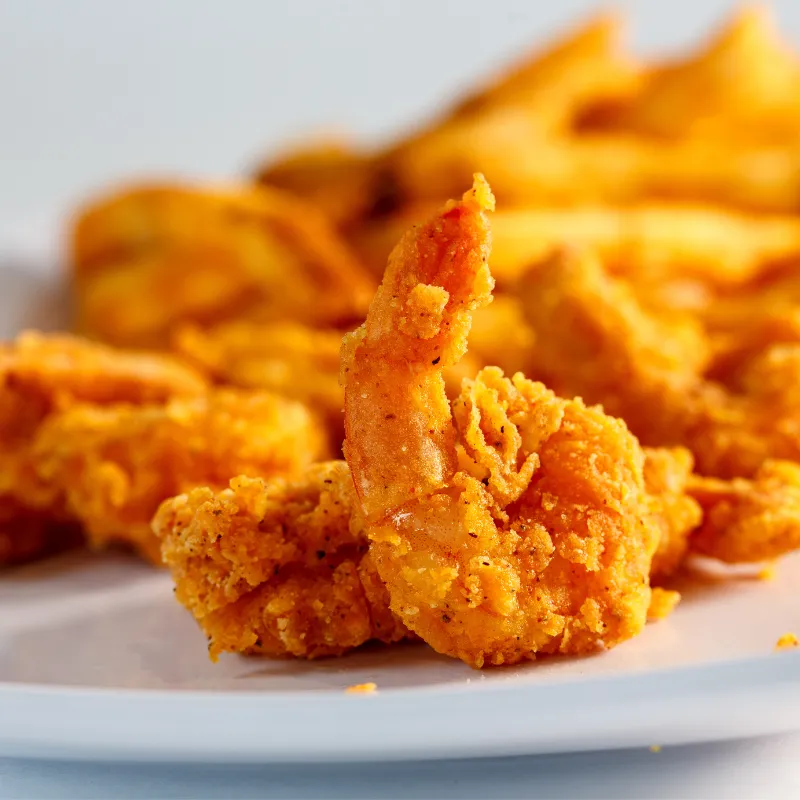 Battered and fried butterfly-cut Shrimp, side salad, French fries, dinner role and medium fountain drink.